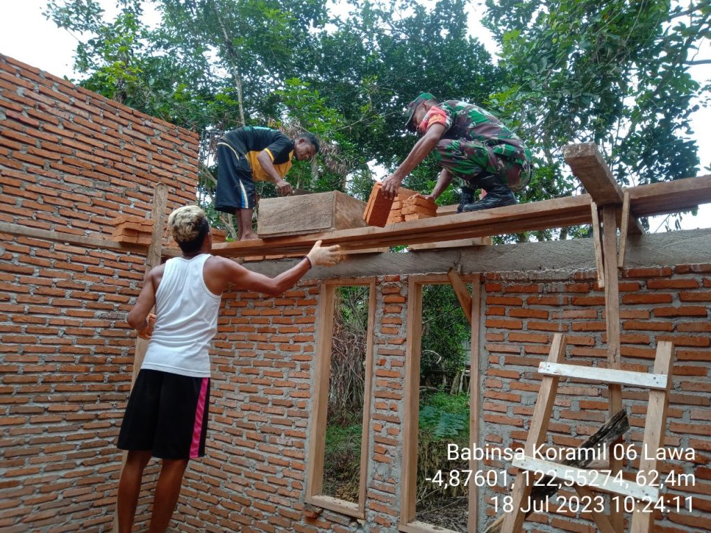 Muna Barat–Babinsa Koramil 1416-06/Lawa Sertu Pardi membantu masyarakat di wilayah binaan membangun dinding rumah, yang bertempat di Desa Wakontu Kec. Wadaga Kab. Muna Barat, (Selasa, 18/7/2023).