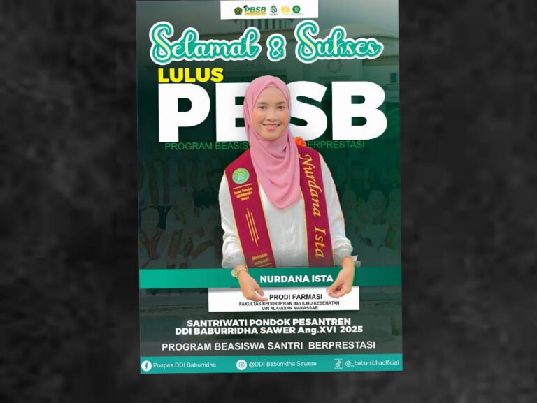 BULUKUMBA— Nurdana Ista, santri asal Desa Bontorannu, Kecamatan Kajang, Kabupaten Bulukumba, berhasil meraih Beasiswa Santri Berprestasi (PBSB) dari Kementerian Agama RI dan resmi diterima sebagai mahasiswa baru di Jurusan Farmasi, Fakultas Kedokteran dan Ilmu Kesehatan (FKIK) UIN Alauddin Makassar Tahun Akademik 2025/2026.
