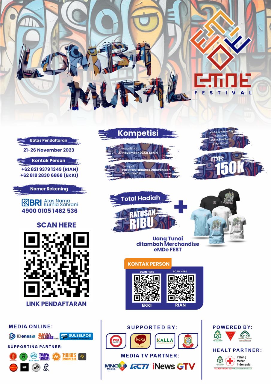 Dalam rangka menyambut Malam Puncak eMDe FEST, Himpunan Mahasiswa Jurusan (HMJ) Manajemen Dakwah (MD) Fakultas Dakwah dan Komunikas (FDK) Universitas Islam Negeri Alauddin Makassar buka pendaftaran lomba mural dalam rangka menyambut malam puncak eMDe-FEST.