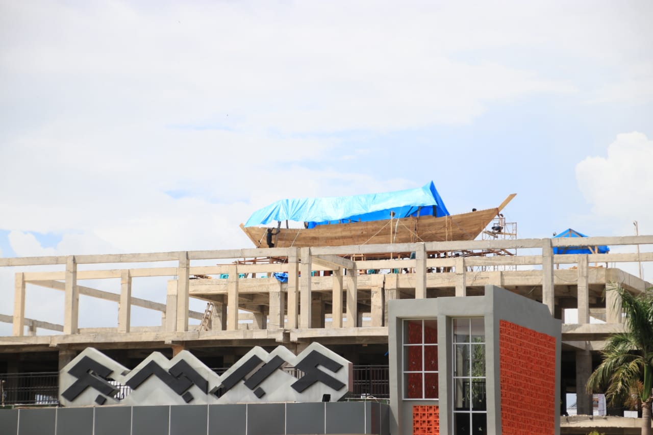 Kini body kapal Pinisi itu mulai nampak di atas gedung yang memiliki tinggi 16 meter. Tentu semakin indah kelihatan jika tiang dan layar Pinisinya sudah selesai. (Red-oborbangsa-Asizul-Raiz)