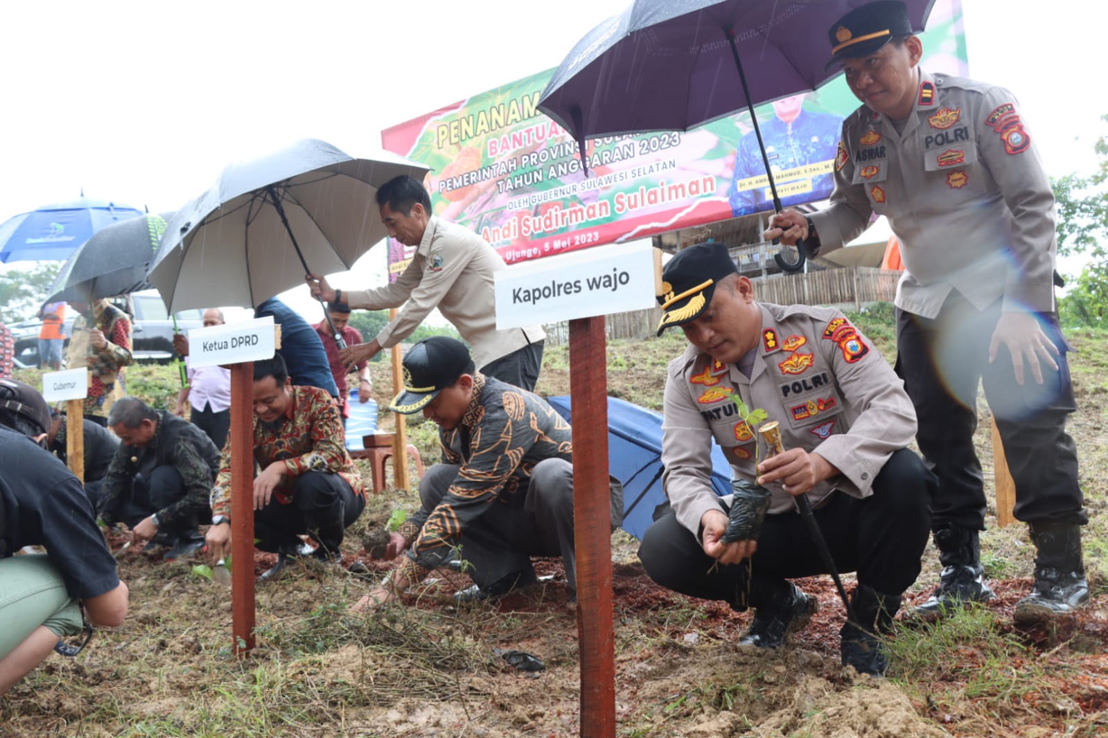 Kapolres Wajo AKBP Fatchur Rochman dampingi Gubernur Sulsel Andi Sudirman Sulaiman melakukan penanaman Murbei di Desa Ujunge Kecamatan Tanasitolo, Kamis (04/05/2023).
