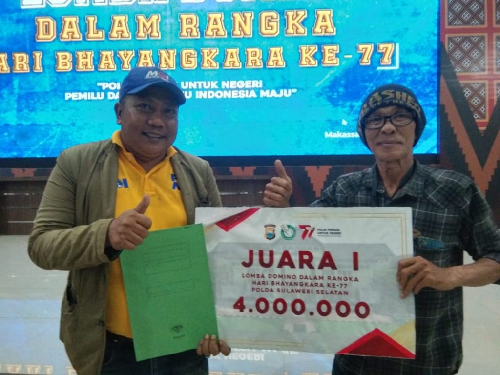 Makassar – Dengan melalui proses panjang akhirnya usai sudah perlombaan domino antar Journalist yang di helat oleh Kapolda Sulsel, Pak Muchlis alias Etta berpasangan dengan Muhammad Kasim alias beny.etta salah seorang Wartawan senior dan Jungah ketua RCWI radio celoteh wartawan Indonesia berpasangan dengan Beny yang Jungah pimpinan umum Zonametro.id dan wakil sekretaris DPW MOI Sulsel meraih juara 1 pada kejuaraan Domino di hari HUT Bhayangkara ke -77 di Polda Sulsel