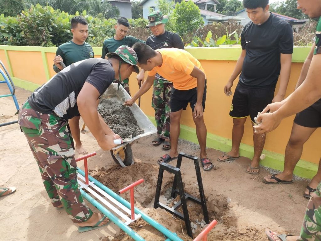 Sesuai dengan penyampaian Kapten Inf Andri Fitri, Pasiter Kodim 1203 Ktp pada sasaran fisik Paud Harum Kenanga hari ini sebagian Satgas masih melanjutkan merapikan dan membersihkan sasaran fisik tersebut, namun sebagian Satgas ada yang memasang rangkaian permainan anak-anak.