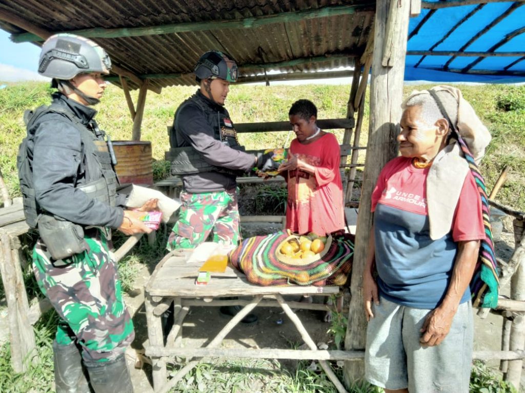 Papua, -Dalam rangka membantu masyarakat Distrik Mulia yang kesulitan menjual hasil kebunnya, anggota Satgas Yonif RK 115 ML Pos Ramil Yambi setia membeli atau menukar hasil kebun masyarakat dengan bahan makanan yang dimiliki oleh Pos. Seperti yang dilakukan pada Hari Senin tanggal 26 Juni 2023 Mama Narika Telenggen dan Mama Emi Telenggen datang untuk menukar hasil kebunnya.