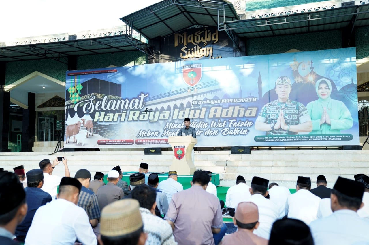 “Sholat Ied berjamaah bersama-sama bukan hanya sekedar melaksanakan perintah Allah, bukan hanya sekedar melaksanakan kewajiban bagi seorang Islam, tetapi dimaknai dengan suatu ikatan yang kokoh dan kuat. Ikatan kebersamaan antara TNI, Kodam XIV Hasanuddin, keluarga dan seluruh masyarakat Makasar, Sulawesi Selatan dan seluruh Indonesia, dalam rangka sama-sama kita menjaga keamanan, kedamaian dan ketenteraman”, Sambungnya.