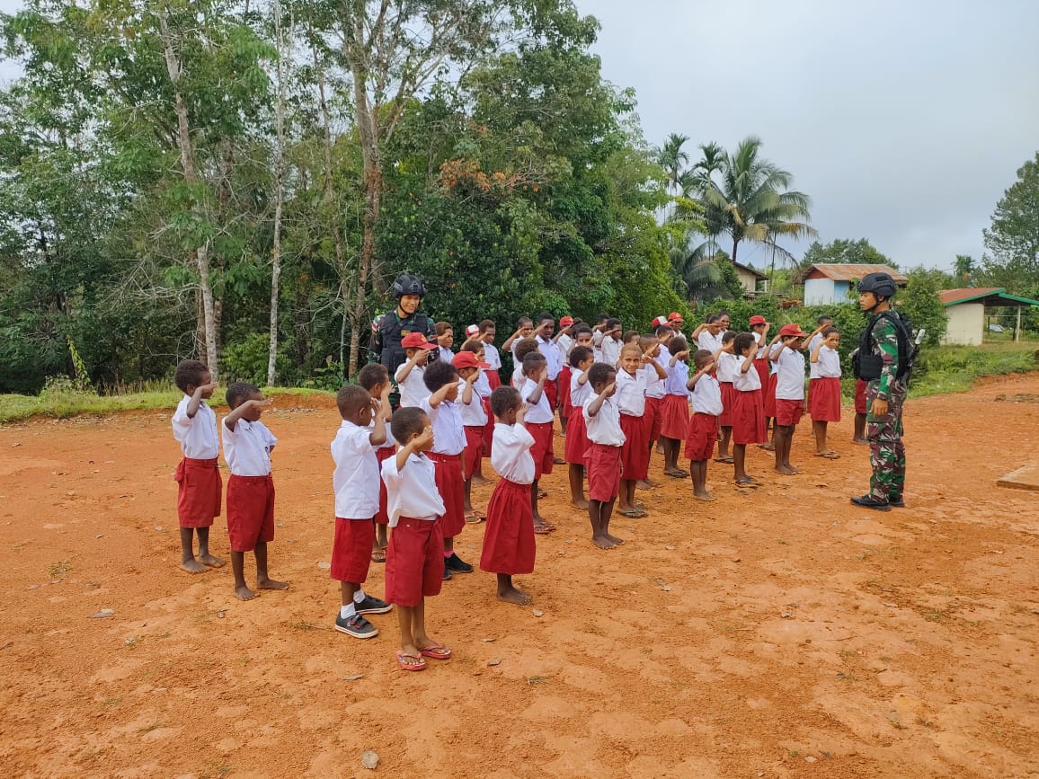 Boven Digoel – Prajurit TNI Satgas Pamtas RI-PNG Yonif 725 Woroagi yang berada di Pos Amoan memberikan pelatihan Peraturan Baris-Berbaris (PBB) kepada para siswa (i) SD YPPK St. Albertus Amoan, Kampung Amoan, Distrik Kombut, Kab. Boven Digoel, Papua Selatan.
