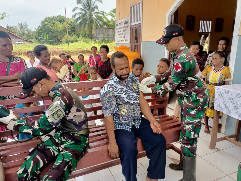 Boven Digoel – Sebagai salah satu upaya untuk menjaga kondisi kesehatan masyarakat yang tinggal di wilayah perbatasan Republik Indonesia (RI) – Papua New Guinea (PNG), Satgas Pamtas RI-PNG Statis Yonif 725 Woroagi Pos Koki C/Camp Modern berikan pelayanan kesehatan kepada warga di Kampung Naga, Distrik Jair, Kab. Boven Digoel, Papua Selatan.