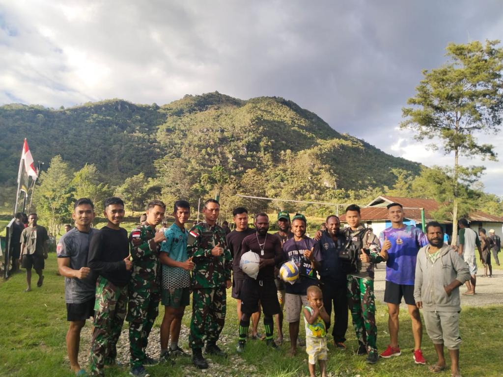 Jayawijaya ~ Untuk meningkatkan minat berolahraga serta menjalin keakraban dengan pemuda dan masyarakat, Satgas Yonif Raider 200 BN melalui Pos Bolakme memberikan bantuan berupa bola voli dan bola kaki dilanjutkan dengan pertandingan olahraga bersama para pemuda Kampung Bolakme, Distrik Bolakme, Kab. Jayawijaya, Papua Pegunungan, Minggu (18/06/2023).