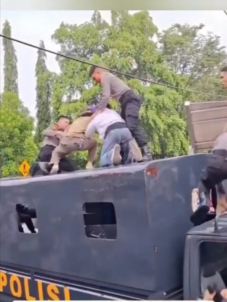 Dalam video berdurasi singkat tersebut, terlihat seorang aparat naik ke atas mobil untuk menghentikan aksi mereka.