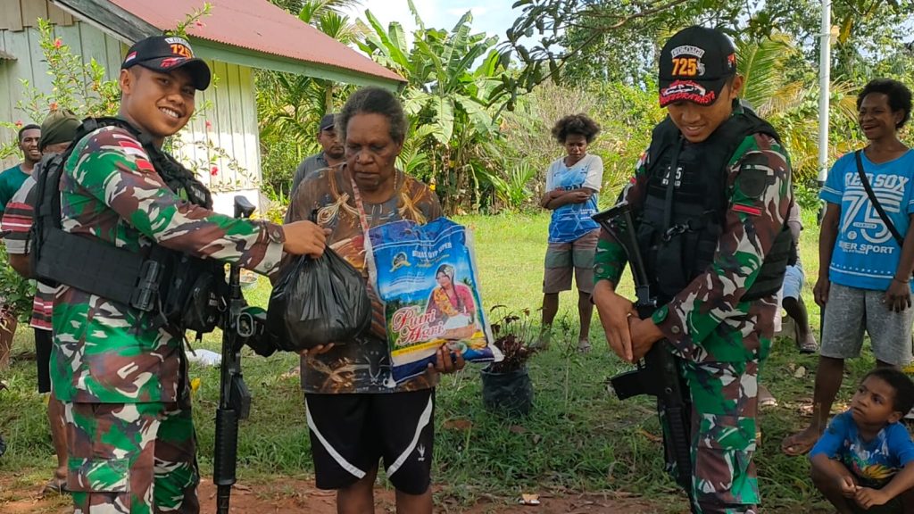 Boven Digoel – Sebagai salah satu wujud kepedulian kepada masyarakat perbatasan, Satgas Pamtas RI-PNG Yonif 725 Woroagi Pos Kotis Asikie yang berada di bawah naungan Kolakops Korem 174 ATW berbagi sembako di Kampung Asikie, Distrik Jair, Kab. Boven Digoel, Papua Selatan.